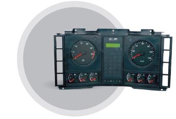 用于上汽依维柯红岩汽车有限公司商用车,该组合仪表包括一个电子转速表,一个车速里程表,一个油量表,两个气压表,一个水温表,一个电压表,一个符号灯板。分别用于指示相应系统的指示值以及报警警示。